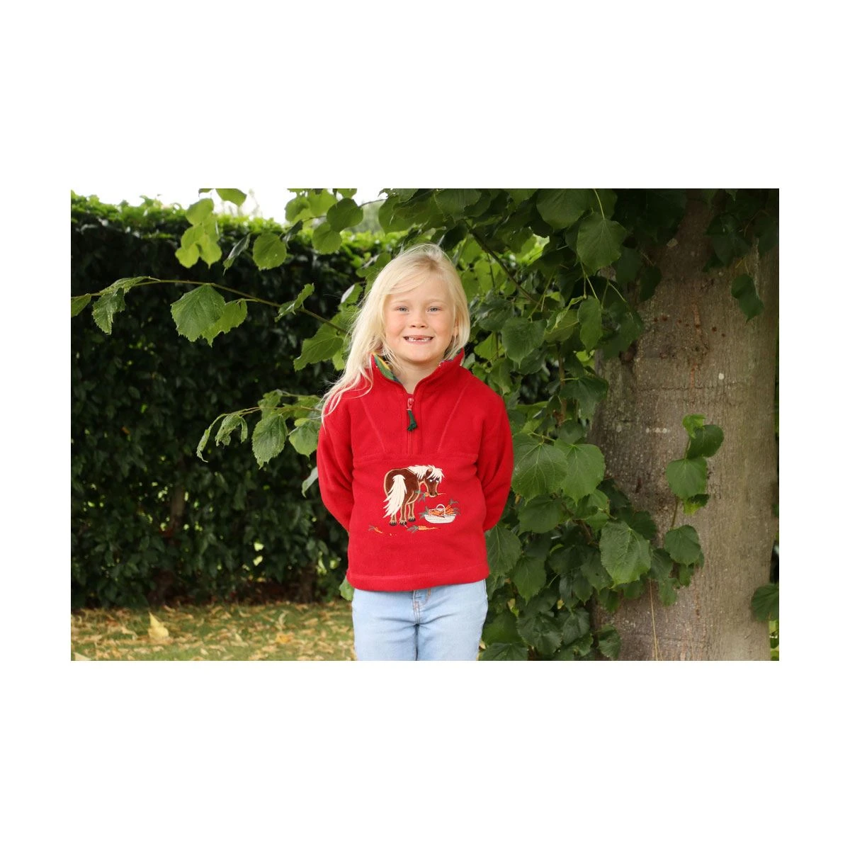 Childrens exquisite applique design fleece jacket with cheeky carrot munching pony.