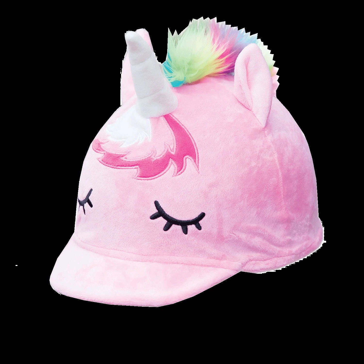 A cute unicorn themed plush fleece hat silk for a riding helmets. Features 3D horn and ears, colourful rainbow mane to back and embroidered face and forelock to front. One size fits all. Machine washable. 100% Polyester.
