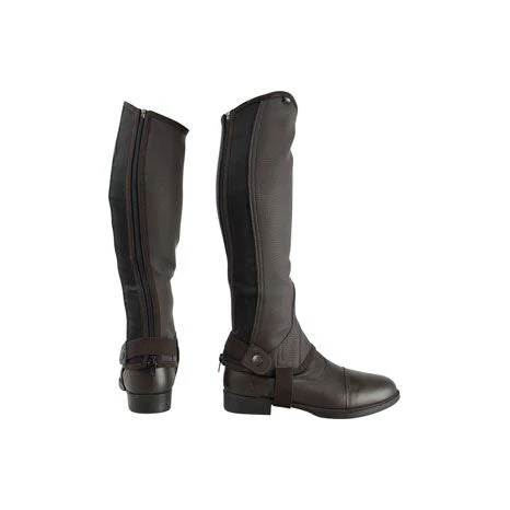 Durable, great every day protection for your leg with these synthetic, leather effect chaps. With an elasticated panel for a snug fit, and an additional panel at the front to easily slide over your jodhpur boots. With a soft, fleece style lining for extra protection, and a strong elasticated press stud fastening around the ankle. These are extremely comfortable to ride in – you will almost forget you are wearing them!