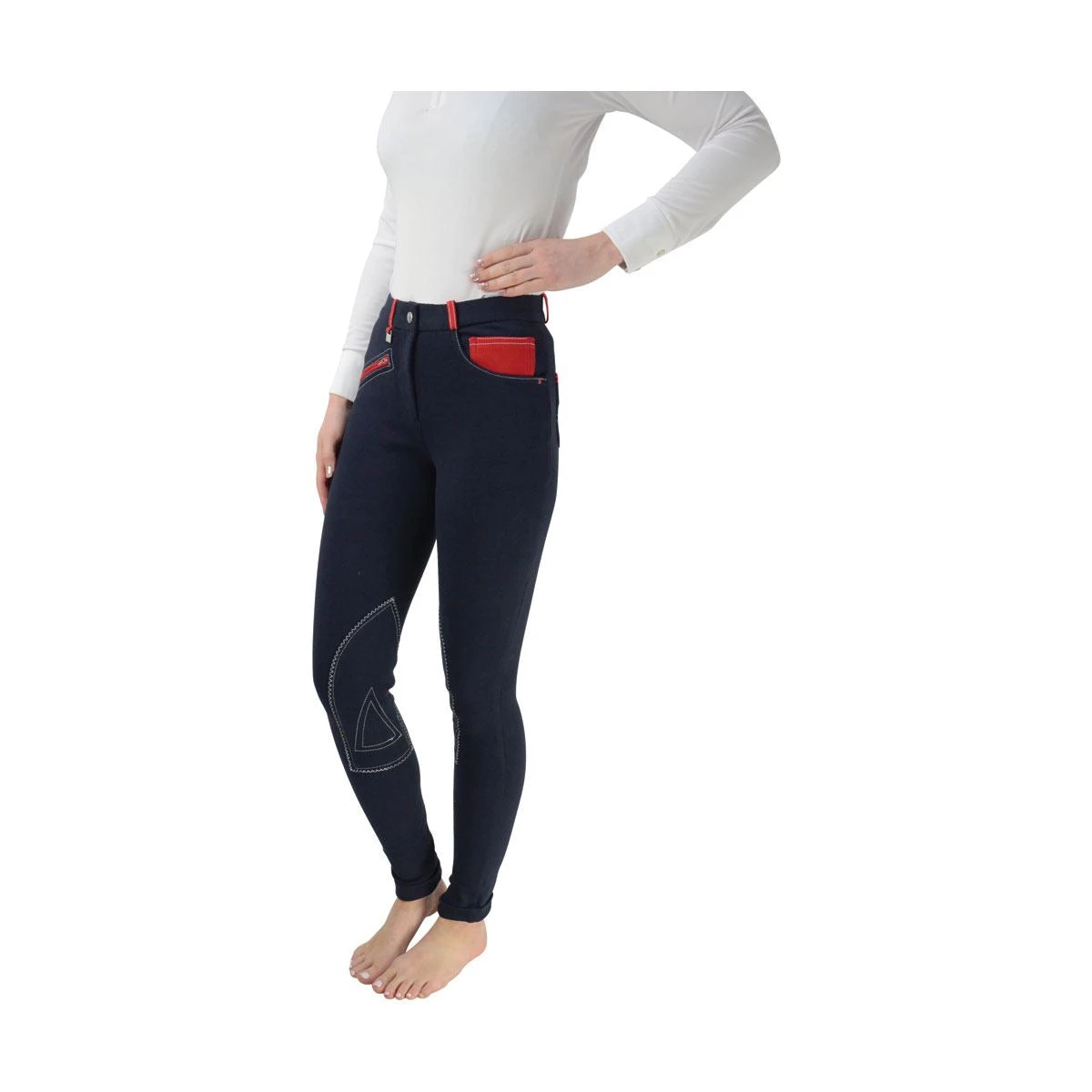 A fashionable jodhpur that gives the look of wearing jeans. A flattering contrast stitch and colour contrast pockets, belt loops and zip detailing make this a must have product. Leg length: Regular. Machine washable at 40C.