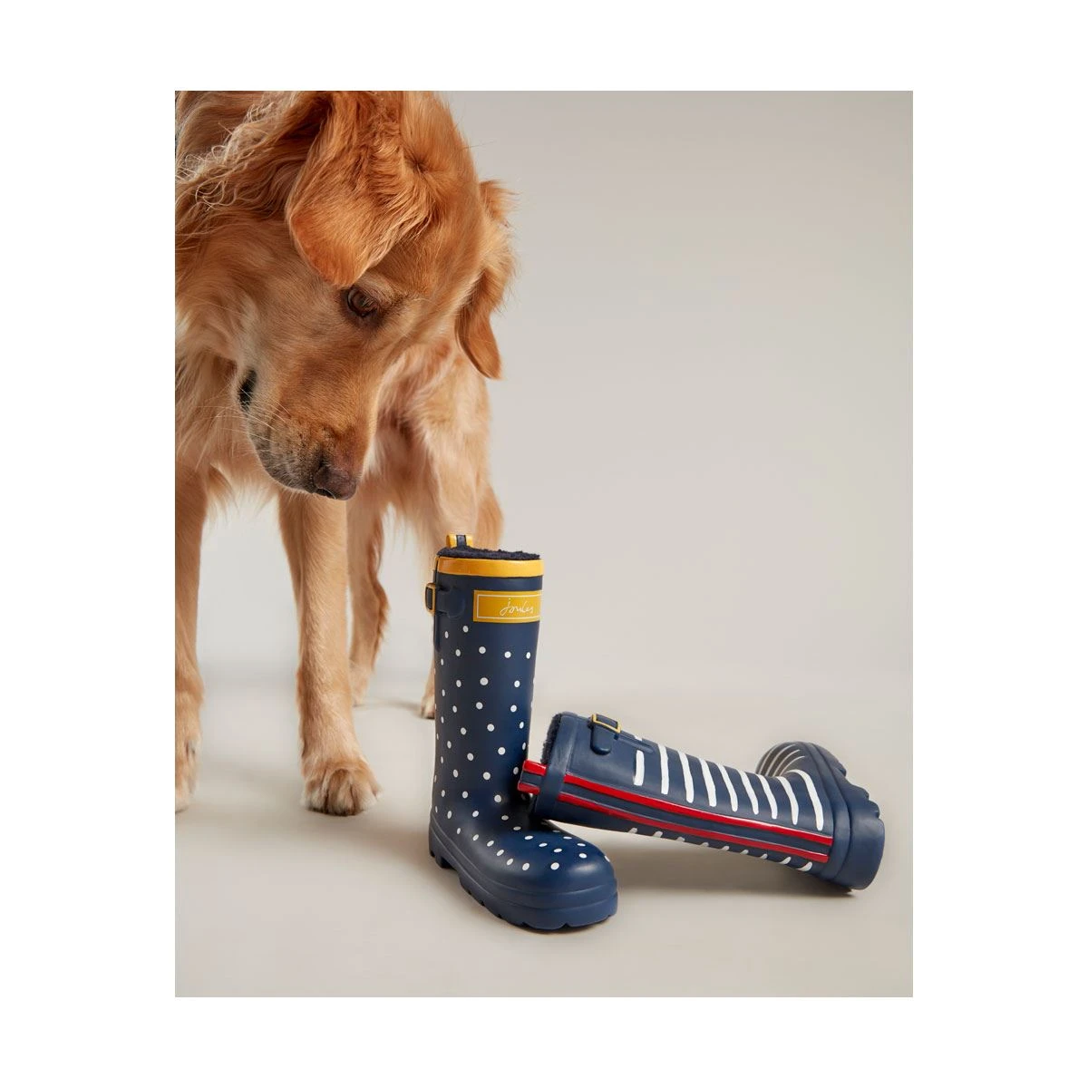 Classic, printed Joules wellington boot which Includes a hidden squeaker, available in two designs. Not suitable for heavy chewers.