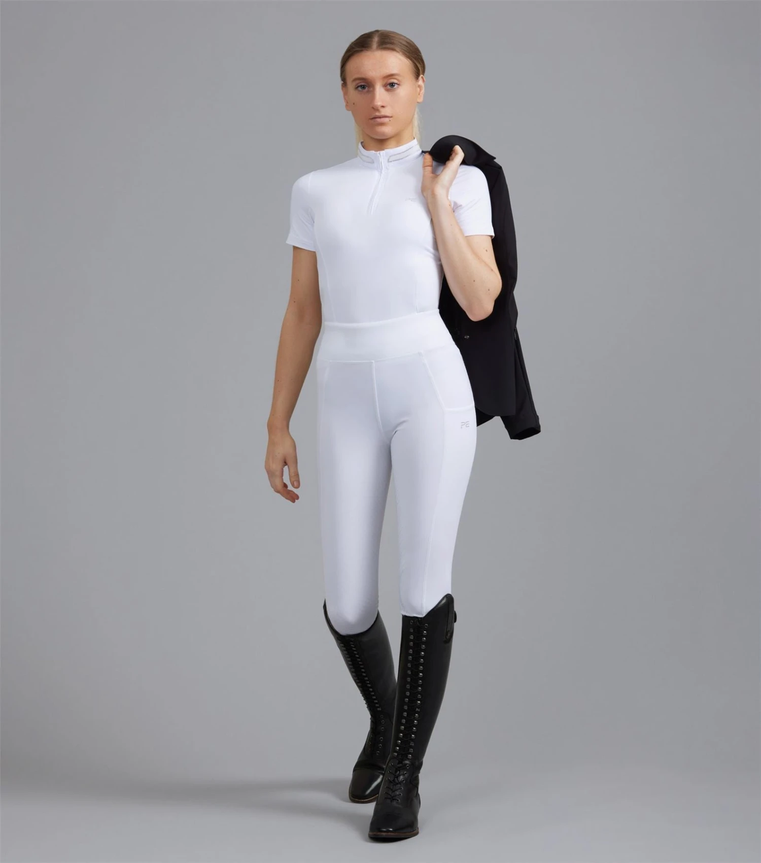 Pull-on riding tights that contour to your shape Technical four-way stretch fabric Breathable Deep waistband Deep front pocket Full seat of mid weight gel ‘PE’ branding