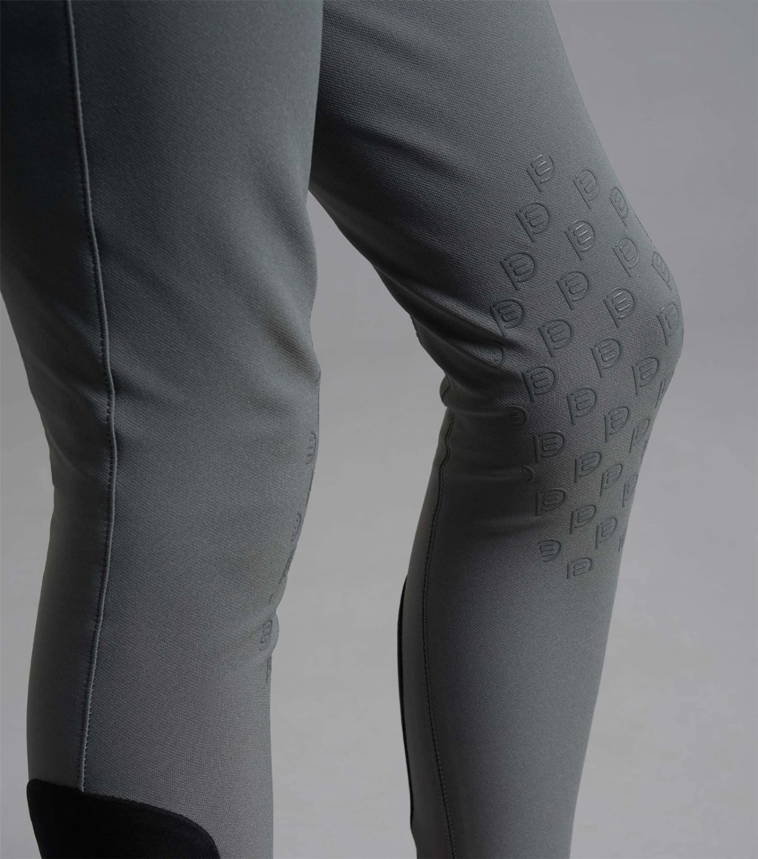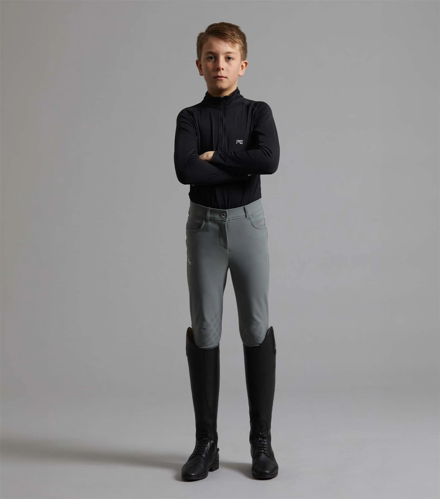 An innovative take on boys riding breeches. Designed with comfort and practicality in mind, the Derby Boys Riding Breeches have been engineered from technically advanced materials to offer a smart style whilst being highly breathable. Traditional front scoop pockets and a front slider fastening have been incorporated for functionality and subtle PE branding has been added to provide a mature look. Excellent stretch properties combined with patterned gel knee patches to offer greater security in the saddle, make these boys riding breeches perfect for everyday training and competitions. Style with one of our children’s riding tops or Kids Pro Rider Jackets to complete your equestrian look.