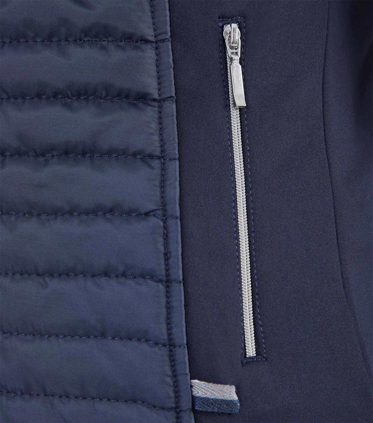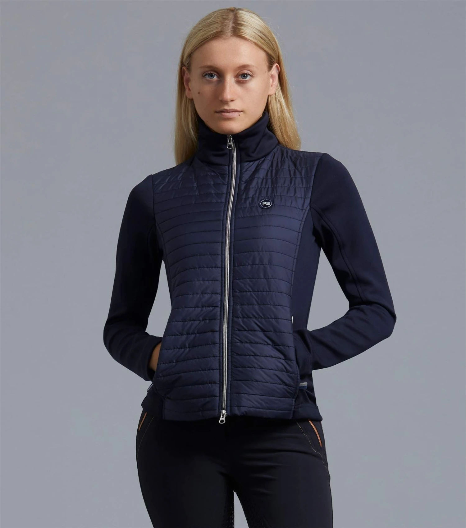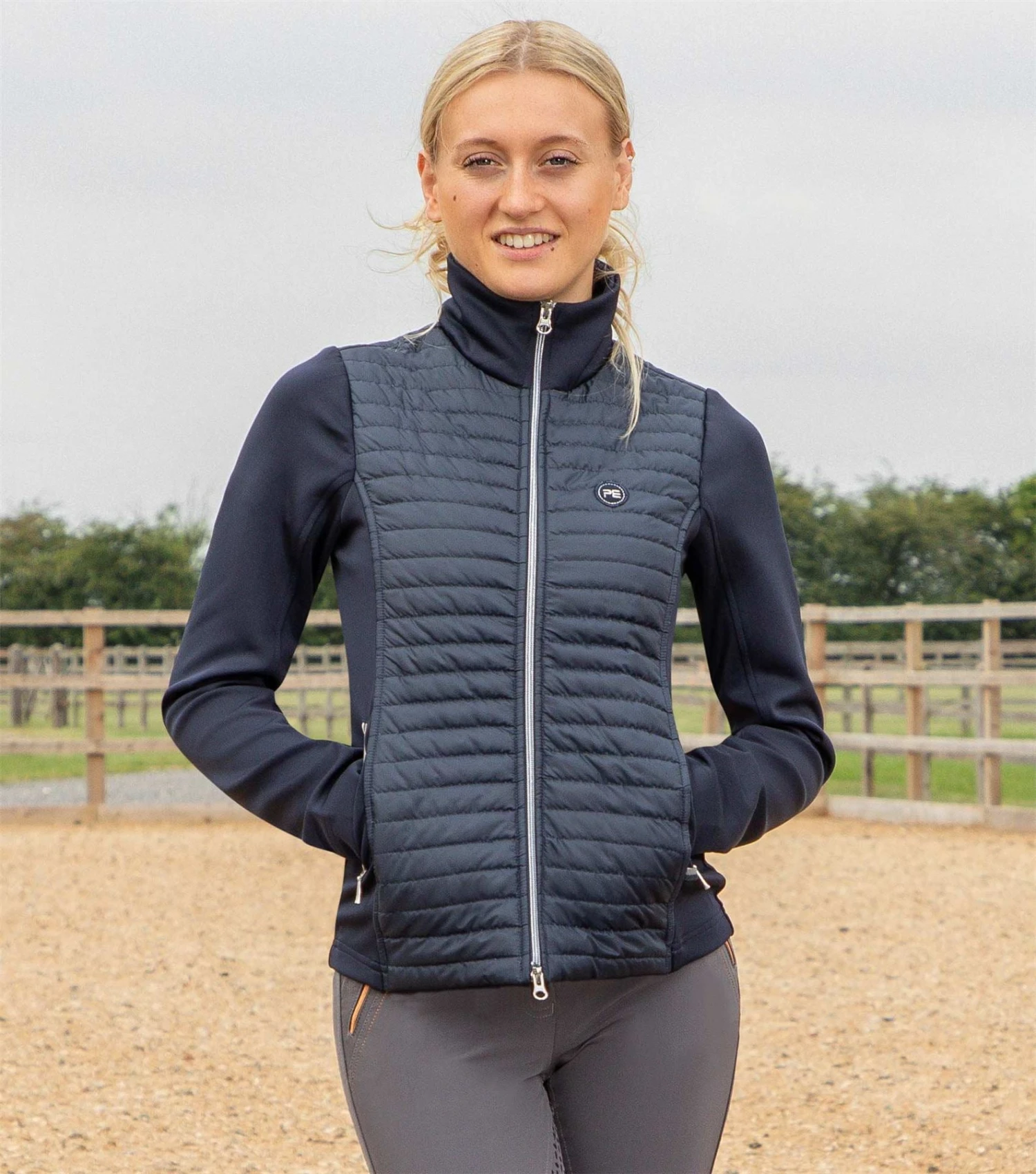 Integrated quilted waterproof riding gilet Mid-weight jersey sleeves and under arm panels Moisture wicking/quick drying Two-way YKK front zipper 2 x External zip pockets Standard height collar Flattering seam lines �PE� branding