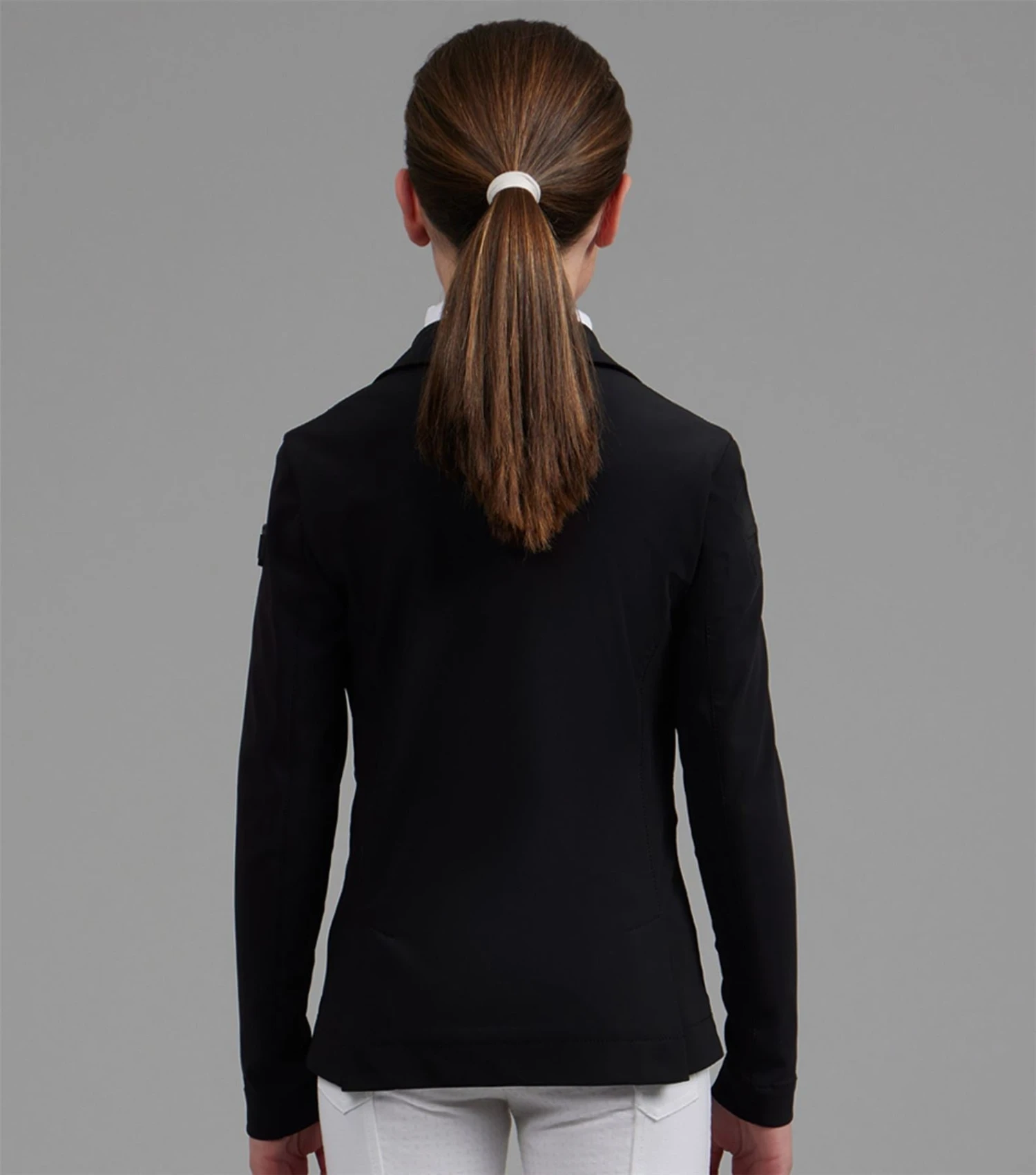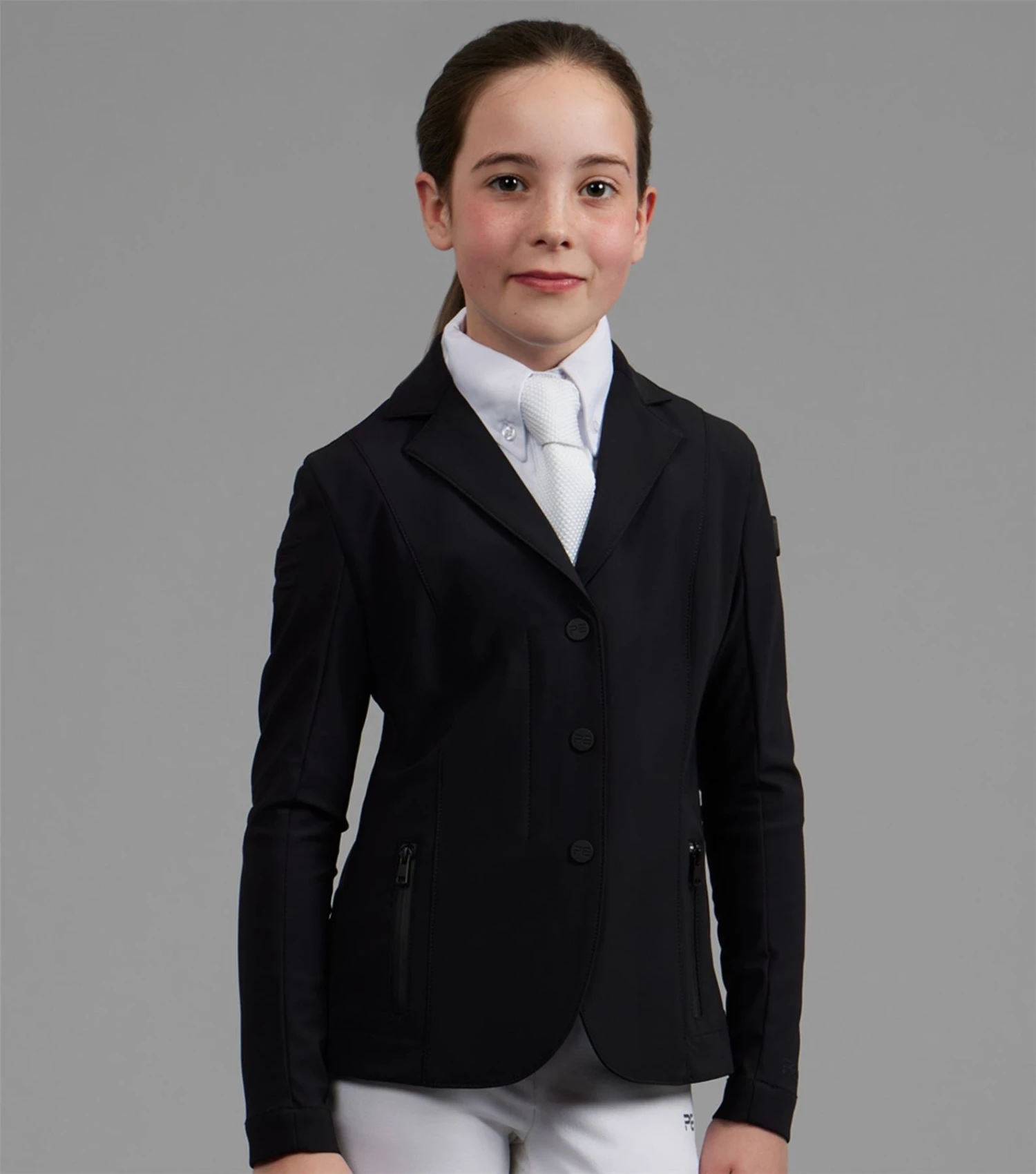 Discover new heights of performance equestrian wear, with intense attention to detail and innovative fabric technology. Focusing on high-quality fabrics and technical materials, the BLACK LABEL represents the pinnacle of refined aesthetics, elite performance and timeless craftsmanship. This girls competition jacket is ideal for a wide variety of equestrian disciplines. This jacket is crafted from a lightweight sleek material that feels luxuriously soft to the touch and comfortable against your skin. The construction provides multidirectional stretch for enhanced freedom of movement whilst offering improved breathability, perfect for the intensity of competition. Classically cut, this competition jacket is formed to provide a flattering silhouette, with meticulously placed style lines. A traditional notched lapel collar sits at the top of a YKK zip, concealed by a clean press stud closure. Two pockets offer a place for storing your valuables, with added security provided by the zip closures of a matte finish. The subtle matte styling continues across the finer details of this jacket, including the branded press stud closures and PE branding at the periphery of the cuff. Our signature chrome PE badge is situated on the rider�s left arm, presenting continuity with our existing collection. An embossed PE form is elegantly rested on the rider�s right arm, boasting the quality and functionality of this luxury performance jacket. An elegant statement piece, this competition jacket is sure to provide a classic sophisticated aesthetic. The soft shade of French Navy allows you to leave a professional impression in the arena, rejuvenating your competition wardrobe. Innovation is in our company DNA. We have taken decades of expertise into new and exciting innovations within performance textiles. Surpassing the limits of current industry standards, every detail is considered, bringing new heights to your equestrian wear. The Evinco Girls Competition Jacket is a key representative of these values, allowing luxury, high-end designs to be accessible and affordable.