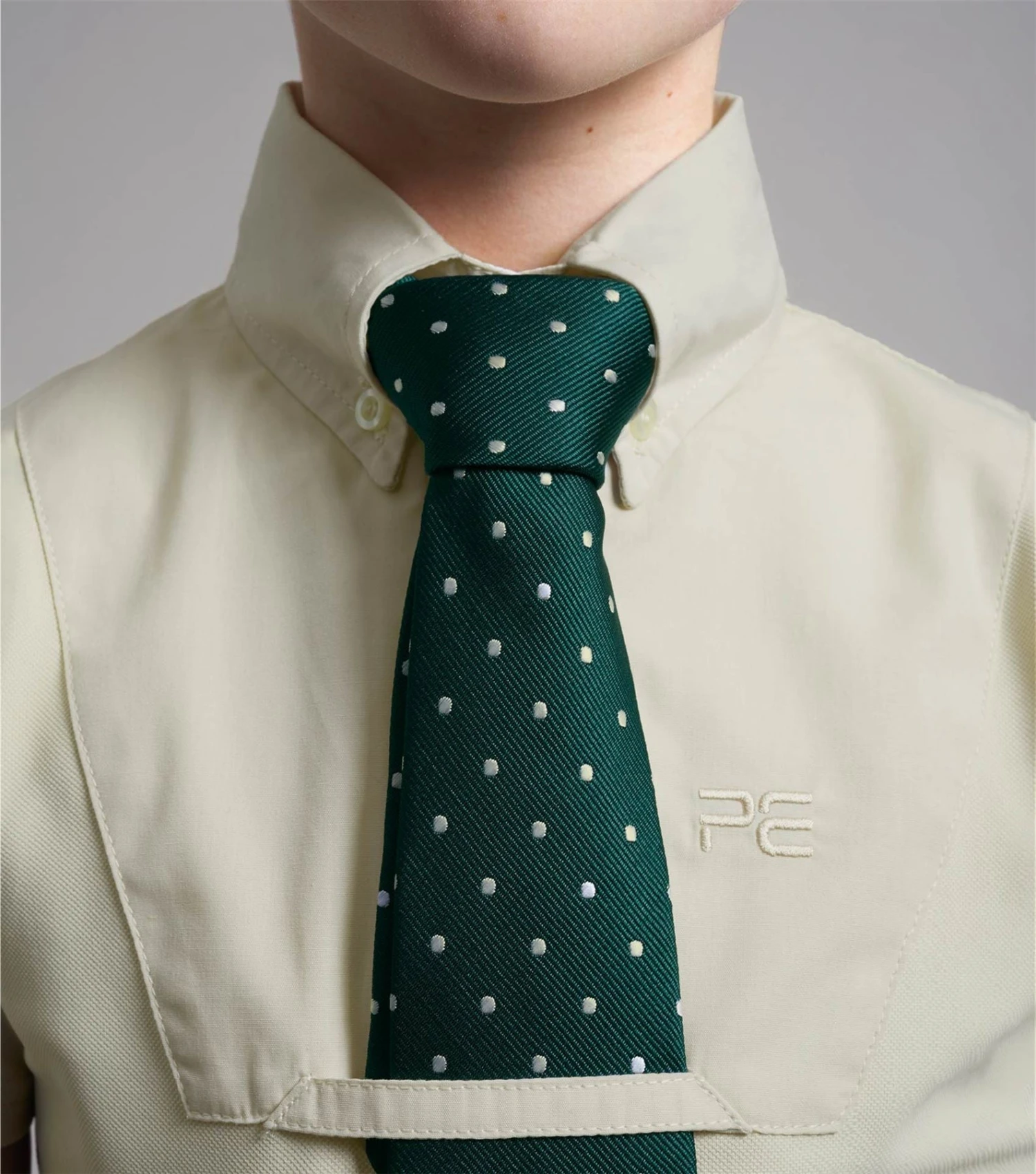 Crisp, smooth cotton poplin cloth has been expertly tailored and set on a base of technical four way stretch pique jersey known as our hydropore fabric. This performance based fabric combination will help wick away moisture and keep you cool on warm days. Short sleeves provide maximum breathability when worn underneath a competition jacket. Designed to be worn with a tie and featuring a tie tuck to hold the tie perfectly in place. Holding buttons on the collar corners create a traditional equestrian look, perfect for showing and other riding activities.