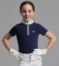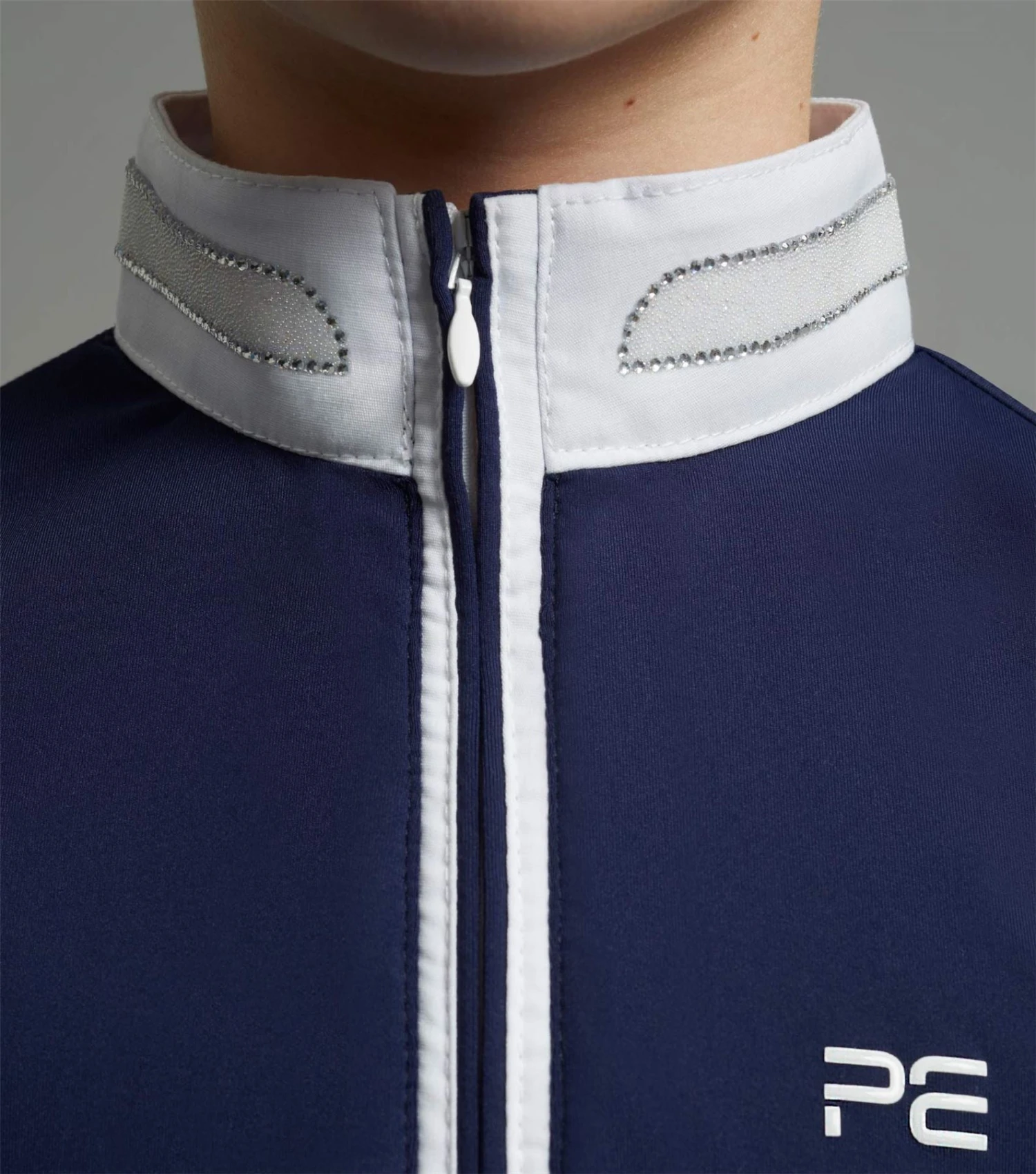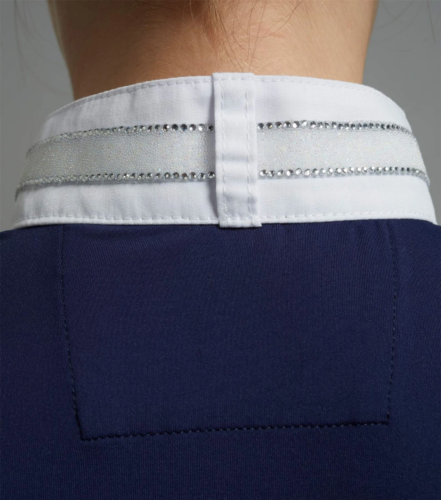 Embellished diamante details set the tone of this girls competition shirt which has been crafted from our high quality jersey for a style that truly performs. The main body is constructed from a four-way stretch fabric with excellent moisture wicking properties. This technical fabric will help keep you cool whilst looking effortlessly stylish in the show ring. The collar is delicately decorated with sparkling crystals and is set on a pristine, high quality cotton poplin. The invisible front zip entry is finished with contrast piping which accentuates your profile. Ideal for riders who want to make a lasting impression.