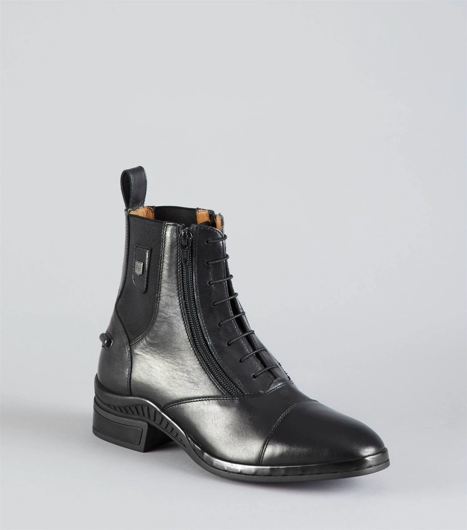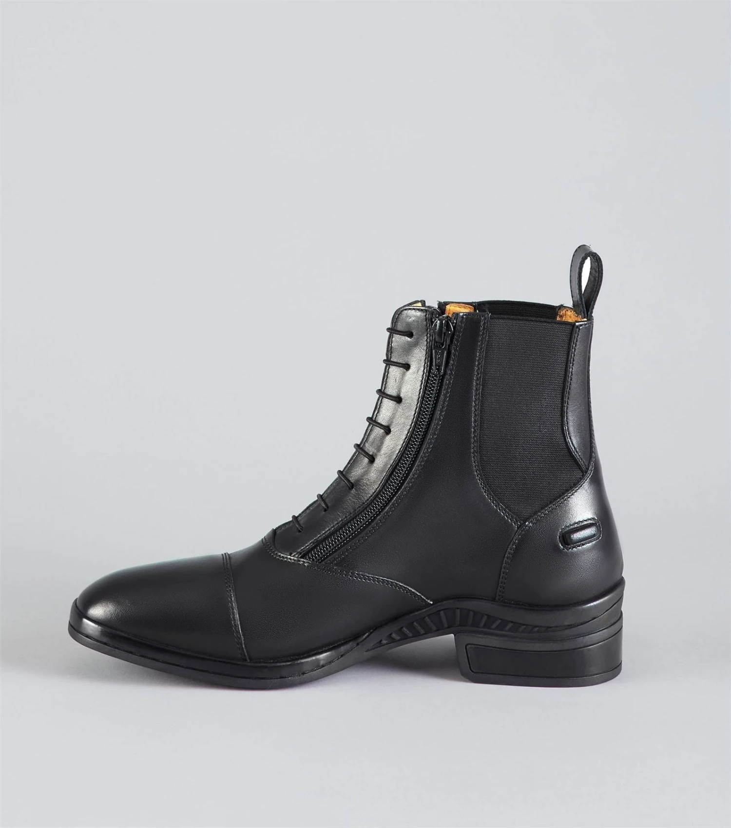 Premium grade leather Premium grade leather lining Elastic side panel Double YKK front zip fastening Soft square toe shape Elasticated lace front panel Added arch support Two point rear spur rest Rear pull-on tabs Anti-slip tread Rubber sole Comfort insole PE branded badge