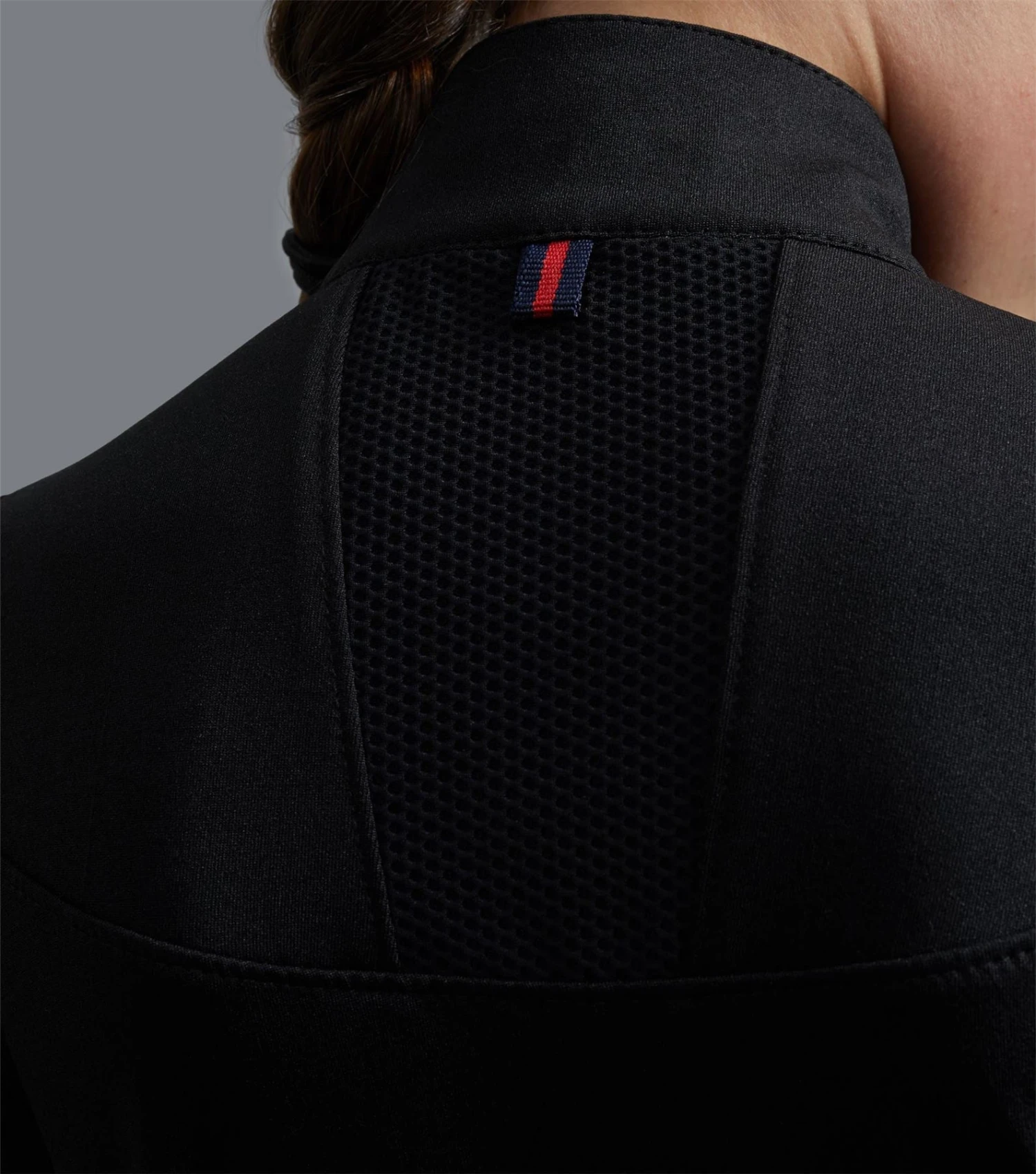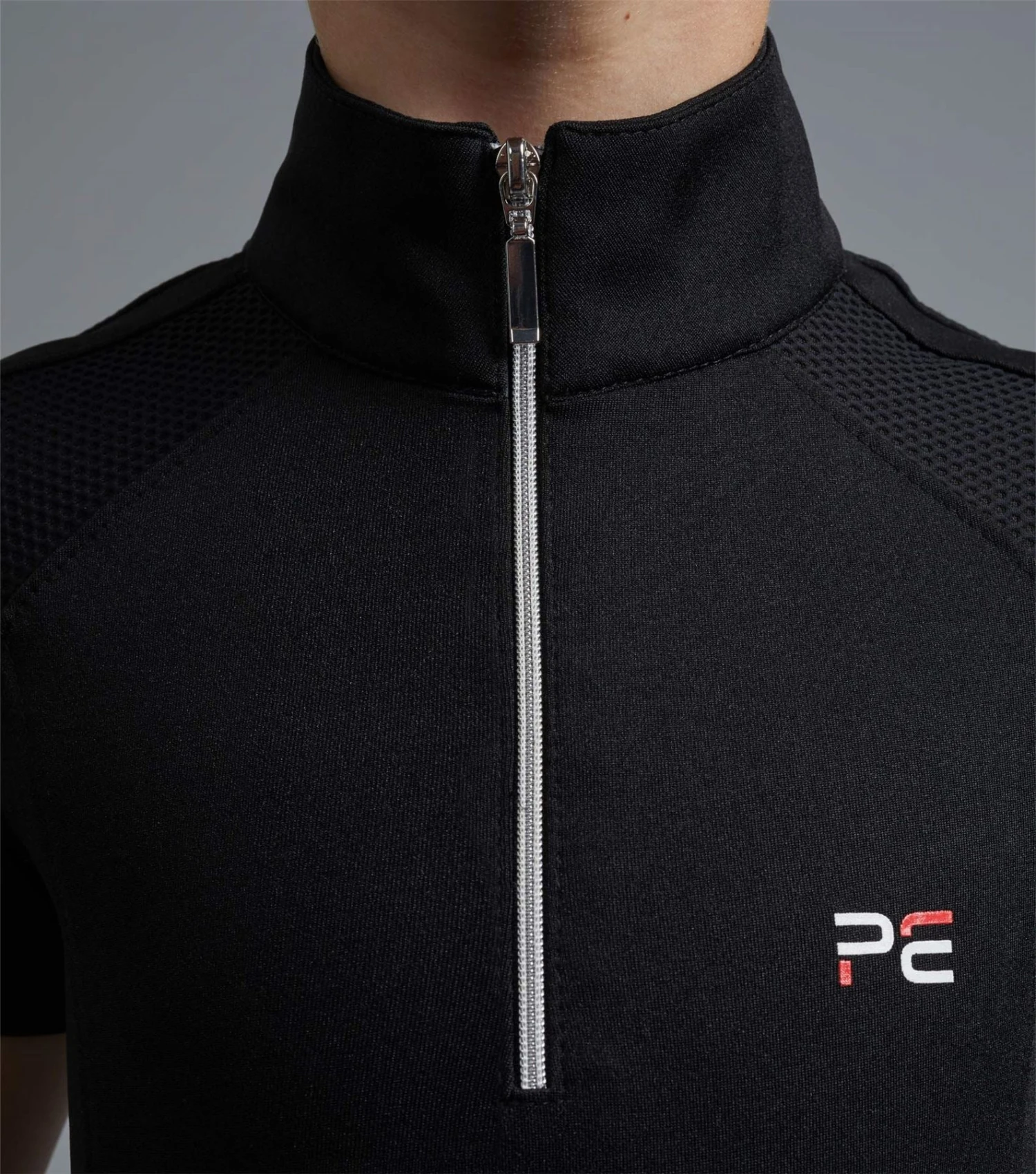 Offering a fitted aesthetic, this girl’s technical riding top has been engineered to provide unrestricted 360� stretch with a lightweight performance jersey construction that provides exceptional moisture wicking properties. Highly breathable, this short sleeved children’s training top incorporates ventilation panelling to the front of the shoulder and over the central upper back panel for optimum airflow during riding / training. To compliment the mesh sports panels, pleated fabric features over the sleeve edge add a layered dimension. A 1/4 YKK zip accents the standard height collar and flattering seam lines created a panelled look to enhance the silhouette. Style with a pair of Junior Riding Breeches.